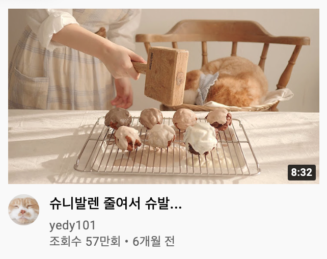 이 영상이 알고리즘에 뜬다면, 궁금해서라도 한 번 눌러보지 않을까? 썸네일은 분명 따스한 햇살의 베이킹 영상인데 제목은 왜인지 '슈발'이 들어간다. 이렇게 부드러운 영상에 과격한 제목과 자막을 보고 있으면 어느새 7~8분의 영상을 훌쩍 보게된다. 이게 이 채널의 차별점이자 강점이다.